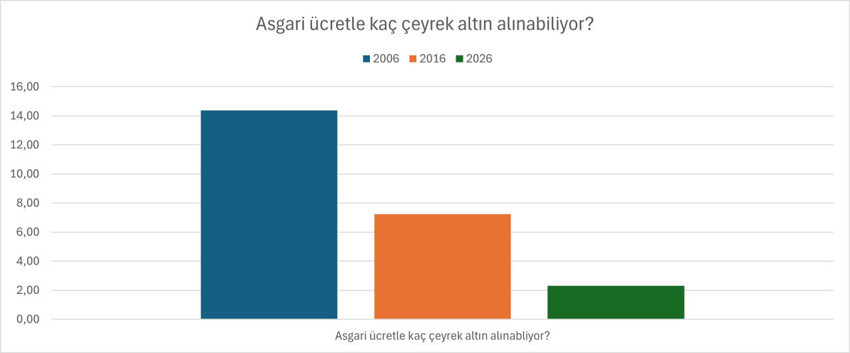 20 yıl önce 2006 yılında çeyrek altın 36,95 TL olurken, yılında 531 TL olan asgari ücretle yaklaşık 14 çeyrek altın alınabiliyor.