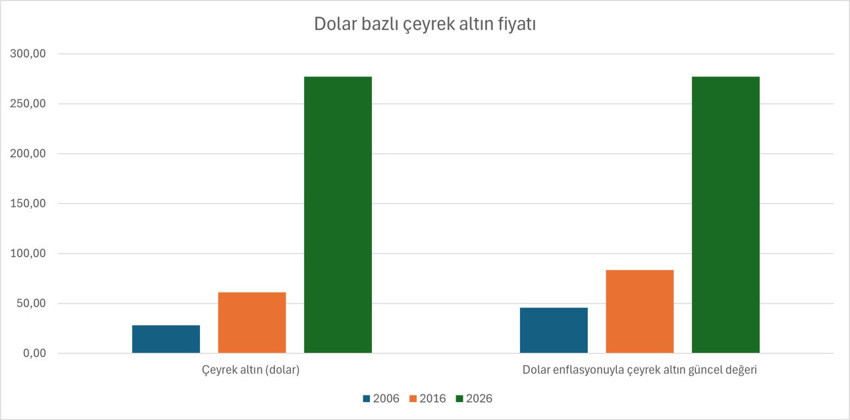 Dolar bazında bakıldığında 2006 yılında çeyrek altın 28 dolar ederken, 2016’da 61 dolar ve 2026’da da 277 dolar ediyor.