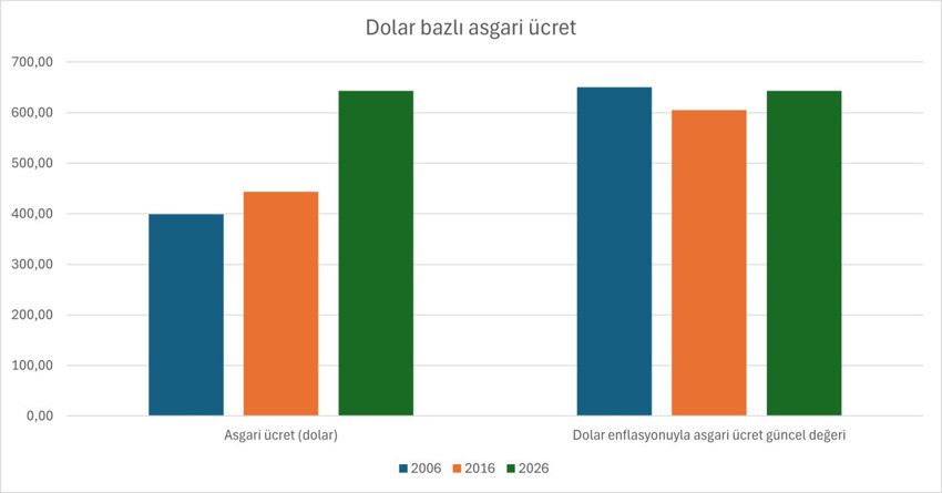 2006 yılında 399 dolar karşılığındaki asgari ücret günümüzde 650,72 dolara karşılık geliyor. 2016 yılındaki asgari ücret de 605,44 dolara denk olurken, güncel asgari ücretin dolar karşılığı 643 dolar oluyor. Asgari ücretin dolar karşılığında nominal artış olsa da enflasyondan arındırıldığında çok bir değişim görünmüyor.