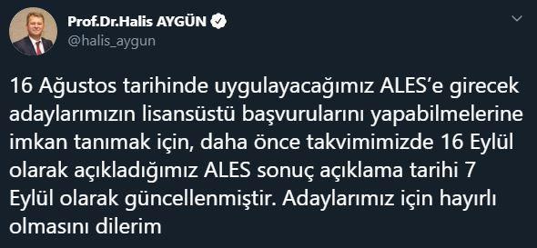 ÖSYM Başkanı Halis Aygün: 16 Ağustos tarihinde uygulayacağımız ALES’e girecek adaylarımızın lisansüstü başvurularını yapabilmelerine imkan tanımak için, daha önce takvimimizde 16 Eylül olarak açıkladığımız ALES sonuç açıklama tarihi 7 Eylül olarak güncellenmiştir. Adaylarımız için hayırlı olmasını dilerim