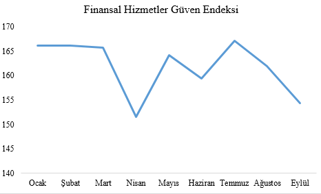 Finansal hizmetler güven endeksi burada değerlendirmeye aldığımız diğer anketlerden farklı olarak inişler ve çıkışlar gösteriyor. Önceki anketlere benzerlik gösteren yanı Temmuz ayı sonrasında hızlanan güven kayıpları olarak görünüyor.