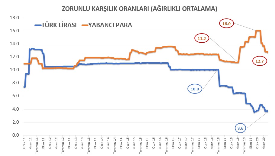 Bu defa, normalleşme sürecinin bir parçası olarak, finansal istikrarın desteklenmesi amacıyla, yabancı para zorunlu karşılık oranlarının tüm bankalar için tüm yükümlülük türlerinde ve vade dilimlerinde 300 baz puan artırılmasına karar verilmiştir.
