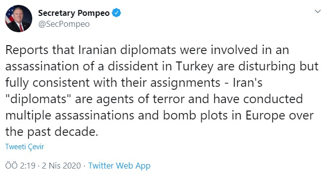 Amerika Birleşik Devletleri Dışişleri Bakanı Mike Pompeo, resmi Twitter hesabından, geçen yıl İstanbul Şişli’de, İran İstihbarat Servisi’nin eski üyesi Mesut Mevlevi’nin öldürülmesiyle ilgili açıklamada bulundu.