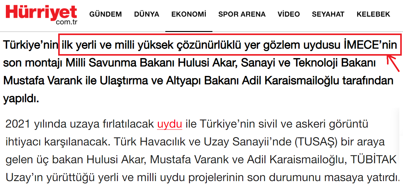 Ulaştırma bakanımıza göre, daha önceki Bakan Lütfi Elvan tarafından 2019’da fırlatılacağı açıklaması yapılan İmece uydusunun, 2022’de uzaya ilk yerli ve milli uydu olarak gönderileceği açıklaması aynı zamanda daha önceki tüm uyduların ilk yerli ve milli uydu olması haberlerinin yanlışlığını ortaya koymuş durumda.