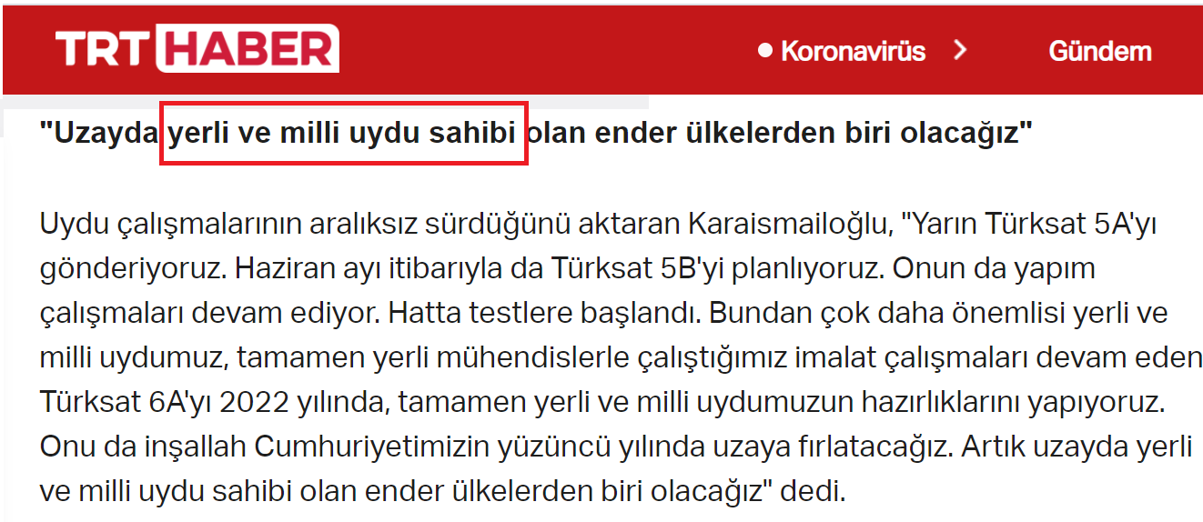 Aşağıdaki haberlere baktığınızda 2012 yılından 2022 yılına kadar en az 5 farklı uydunun her birinin fırlatma töreni açıklamalarında ilk yerli ve milli uydu olarak ilan edildiğini göreceksiniz.