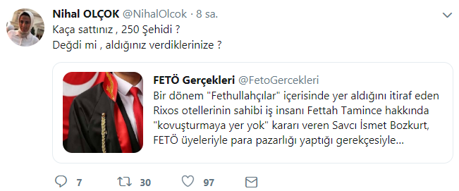 Nihal Olçok, kişisel Twitter hesabından ise, "Kaça sattınız 250 şehidi? Değdi mi, aldığınız verdiklerinize" diye belirtti.
