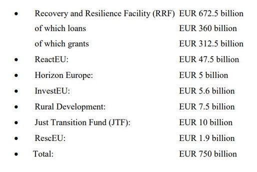 Toplam 750 milyar euro tutarındaki anlaşmanın 672.5 milyarlık kısmı toparlanma ve dayanıklılık artırma programı çerçevesinde kullanılacak. 47.5 milyarlık kısmı ‘ReactEU’ programı aracılığıyla pandemiden ciddi derecede etkilenen üye devletlerin kararlı bir şekilde toparlanması için kullanılacak.