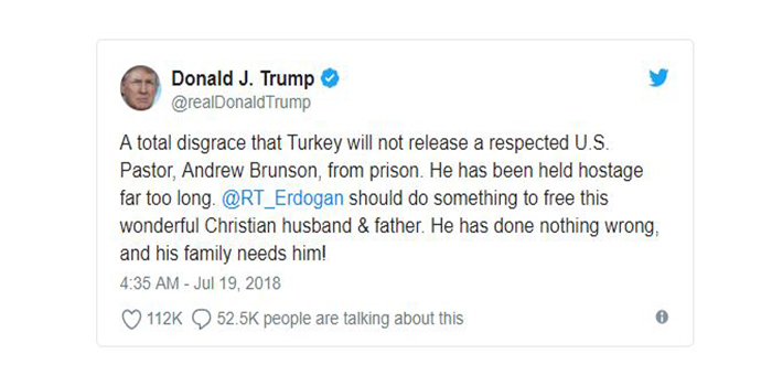 Papaz Brunson'ın tutukluluğu, Türkiye ve ABD arasında gerginliğe neden olan konulardan biriydi. ABD Başkanı Donald Trump, geçen haftaki duruşmada Brunson'ın tutukluluk hâlinin devamına karar verilmesinin ardından Twitter üzerinden yaptığı açıklamada, 50 yaşındaki papazın serbest bırakılması için yaptığı çağrıyı yinelemişti. Trump, "Türkiye'nin ABD'li saygın bir papaz olan Andrew Brunson'ın tahliye etmemesi tam bir rezalet. Çok uzun zamandır rehin tutuluyor. @RT_Erdogan bu harika Hristiyan eş ve babanın serbest kalması için bir şeyler yapmalı. Yanlış bir şey yapmadı ve ailesinin ona ihtiyacı var" demişti.