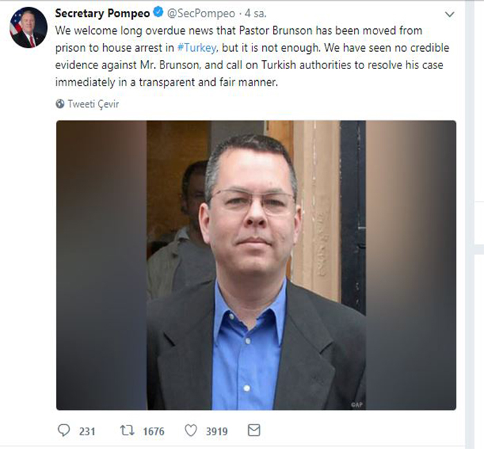 Pompeo konuyla ilgili tweet'inde, "Papaz Brunson'ın Türkiye'de cezaevinden çıkarılıp ev hapsine alınmasını" çok gecikmiş bir haber olarak tanımladı. ABD'li bakan, "Memnuniyetle karşılıyoruz ancak bu yeterli değil. Sayın Brunson'a karşı elle tutulur bir kanıt görmedik ve Türk makamlarını bu davayı derhal şeffaf ve adil bir biçimde karara bağlamaya çağırıyoruz" diye ekledi.