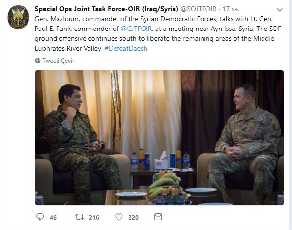 Suriye’nin kuzeyindeki Ayn İsa kasabası yakınlarında gerçekleşen görüşmeye dair fotoğraf, IŞİD ile mücadele koalisyonunun resmi Twitter hesabından paylaşıldı.