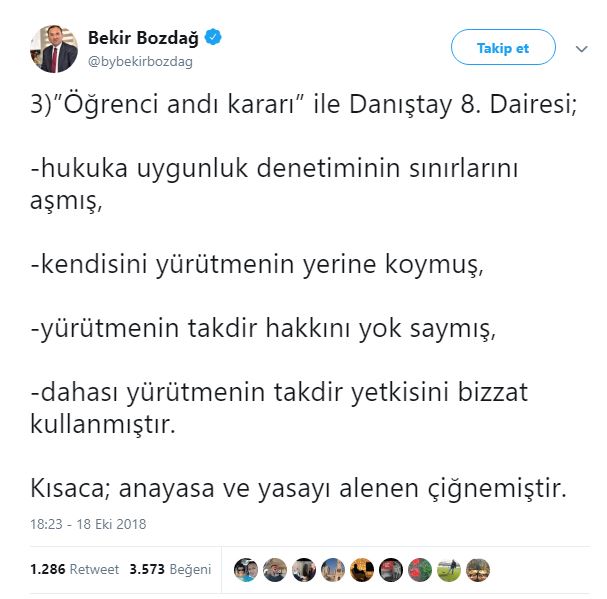 — Türkiye, hukuk devletidir. 'İdarenin her türlü eylem ve işlemlerine karşı yargı yolu açıktır. Yargı yetkisi, idari eylem ve işlemlerin hukuka uygunluğunun denetimi ile sınırlı olup, hiçbir surette yerindelik denetimi şeklinde kullanılamaz. Yürütme görevinin kanunlarda gösterilen şekil ve esaslara uygun olarak yerine getirilmesini kısıtlayacak, idari eylem ve işlem niteliğinde veya takdir yetkisini kaldıracak biçimde yargı kararı verilemez. Öğrenci andı kararı ile Danıştay 8. Dairesi; hukuka uygunluk denetiminin sınırlarını aşmış, kendisini yürütmenin yerine koymuş, yürütmenin takdir hakkını yok saymış dahası yürütmenin takdir yetkisini bizzat kullanmıştır. Kısaca; anayasa ve yasayı alenen çiğnemiştir.
