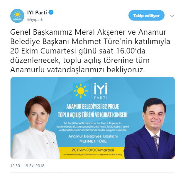İYİ Parti Genel Başkanı Meral Akşener, bugün saat 16.00'da Anamur Belediye Başkanı Mehmet Türe ile birlikte toplu açılış törenine katılacak.