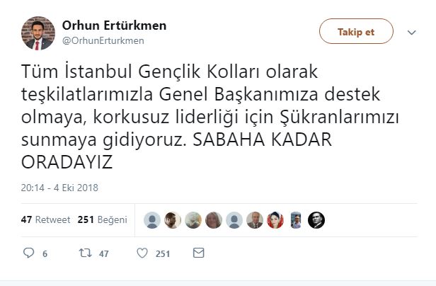 İYİ Parti İstanbul Gençlik Kolları Başkanı Orhun Ertürkmen, Akşener'in evinin önünde yapılan provokasyonun ardından sosyal medya hesabından çağrı yaptı.Sabaha kadar İYİ Parti liderinin evinin önünde bekleyeceklerini söyleyen Ertürkmen, "Tüm İstanbul Gençlik Kolları olarak teşkilatlarımızla Genel Başkanımıza destek olmaya, korkusuz liderliği için Şükranlarımızı sunmaya gidiyoruz. SABAHA KADAR ORADAYIZ" şeklinde paylaşımda bulundu.