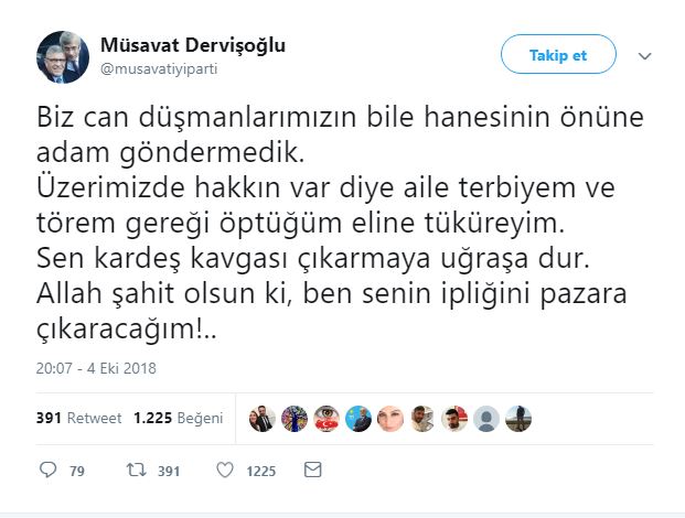 İYİ Parti Genel Başkan Yardımcısı Müsavat Dervişoğlu, Akşener'i hedef gösteren Devlet Bahçeli'ye çok sert tepki gösterdi.Sosyal medya hesabından paylaşımda bulunan Dervişoğlu, "Biz can düşmanlarımızın bile hanesinin önüne adam göndermedik. Üzerimizde hakkın var diye aile terbiyem ve törem gereği öptüğüm eline tüküreyim. Sen kardeş kavgası çıkarmaya uğraşa dur. Allah şahit olsun ki, ben senin ipliğini pazara çıkaracağım!.." ifadelerini kullandı.