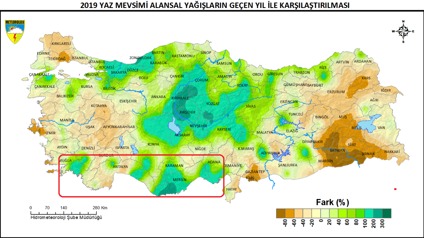 2019 su yılında yağışlardaki artışın Türkiye’nin Güney bölgesinde ve ilkbahar aylarında gerçekleştiği görülüyor. Örneğin MGM verilerine göre yağışlar geçen seneye nazaran Doğu Anadolu’da %29 Güneydoğu Anadolu’da ise % 98 oranında artmış. Bu artışlar uzun yılların normal yağışlarının da sırasıyla %18 ve %67 üzerinde.