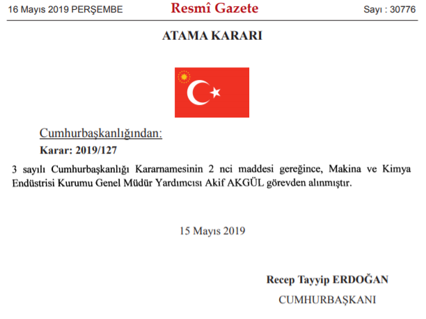 Makina ve Kimya Endüstrisi Kurumu Genel Müdür Yardımcısı Akif Akgül ise yine Resmi Gazete'deki karara göre, görevinden alınmasına karar verildi.