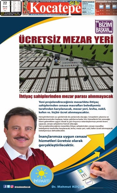 Evet evet yanlış duymadınız Afyonkarahisar’ın İYİ Partili Belediye Başkan Adayı Mahmut Koçak, seçilmesi halinde Afyonlulara bedava mezar yeri dağıtacağını vaad ediyor. Koçak üstelik de bu vaadini projelendirip , çizimleri ile tüm yerel Afyon Gazetelerine ilan olarak da veriyor.