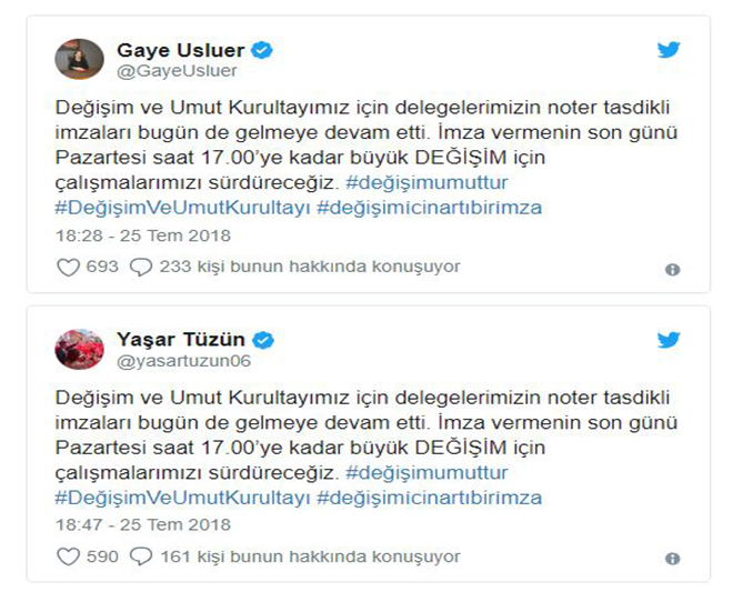 CHP PM üyesi Gaye Usluer ve CHP Bilecik Milletvekili Yaşar Tüzün, kurultay süreciyle ilgili bugün sosyal medya hesaplarından yaptıkları açıklamada, "Değişim ve Umut Kurultayımız için delegelerimizin noter tasdikli imzaları bugün de gelmeye devam etti. İmza vermenin son günü Pazartesi saat 17.00’ye kadar büyük DEĞİŞİM için çalışmalarımızı sürdüreceğiz. #değişimumuttur #DeğişimVeUmutKurultayı #değişimi̇cinartıbiri̇mza" dedi.