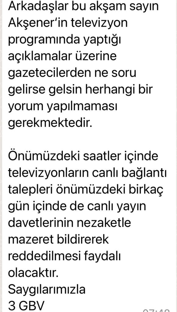 AKP’ye yakınlığıyla bilinen Milliyet yazarı Zafer Şahin’in paylaştığı söz konusu mesaj “3 Grup Başkan Vekili” imzası taşıyor. Mesajda CHP’li milletvekillerine canlı yayınlara mazeret belirterek çıkmama ve Akşener konusunda sorulan sorulara cevap vermeme uyarısı yapıldığı görülüyor.
