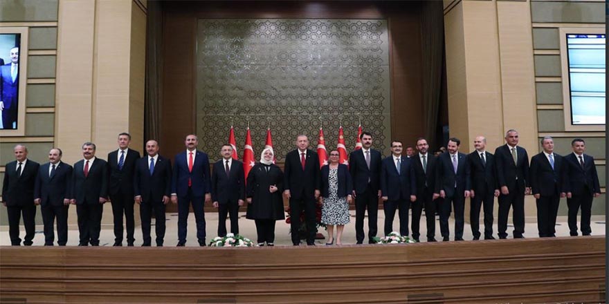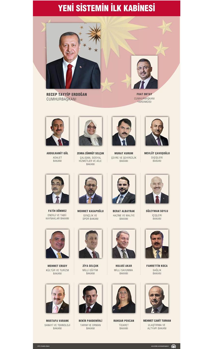Erdoğan, yeni sistemin ilk kabinesini açıklamadan önce yaptığı konuşmada, "Yeni dönemin ruhuna uygun şekilde yönetim mimarimizin çatısını oluşturduk. Büyük ve güçlü Türkiye'nin inşası için yüreğinde ülke ve millet sevdası olan herkesle birlikte çalışmaktan memnuniyet duyacağız." dedi.