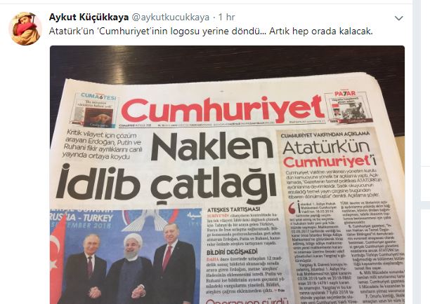 Küçükkaya'nın twitter hesabından yaptığı paylaşım, Cumhuriyet gazetesinin bu günden itibaren takip edeceği çizgiyi özetler nitelikte görüldü.