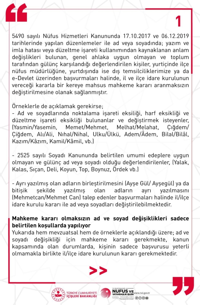 Mahkeme kararı olmaksızın e-Devlet üzerinden ad-soyad değişikliğiyle ilgili sosyal medyada yer alan yorum ve haberlere ilişkin Nüfus ve Vatandaşlık İşleri Genel Müdürlüğü’nden açıklama geldi.
