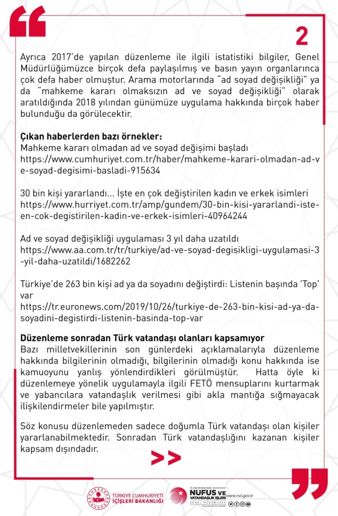 e-Devlet üzerinden ad ve soyad değişikliği uygulamasının, oy kullanacak Suriyelileri perdelemek için kullanılacağı ve bazı FETÖ'cülerin gizlenmesini sağlayacağı iddiaları gündeme gelmişti. Nüfus ve Vatandaşlık İşleri Genel Müdürlüğü'nden açıklama geldi.