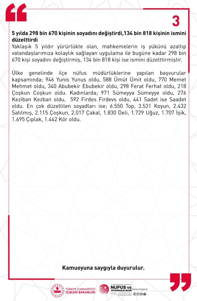 5 yılda 298 bin 670 kişinin soyadını değiştirdiği, 134 bin 818 kişinin de ismini düzelttirdiği belirtildi. Sosyal medyada çıkan iddialar için de “akla mantığa sığmayacak” yorumu yapıldı.