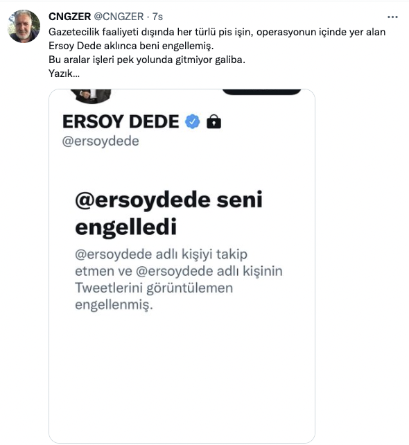Gazeteci Ersoy Dede, Cumhurbaşkanı Recep Tayyip Erdoğan’ın kuzeni olan gazeteci Cengiz Er’i sosyal medyadan engelledi.