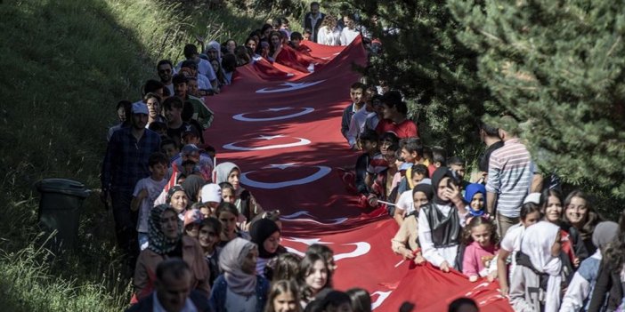Erzurum'da gençler, 15 Temmuz Demokrasi ve Milli Birlik Günü kapsamında 500 metrelik dev Türk bayrağıyla doğa yürüyüşü gerçekleştirdi