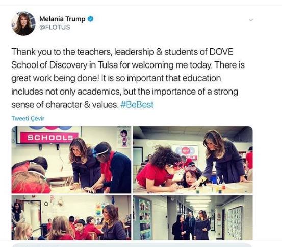 Amerikan First Lady'si Twitter hesabından paylaştığı mesajda, FETÖ okulunun “öğretmenlerine, yönetimine ve öğrencilerine” kendisini ağırladıkları için teşekkür etti. Melania Trump mesajında ‘okulda büyük işler yapıldığını’ yazdı, eğitimde başarı için, sadece akademik başarının değil, ‘karakter ve değerlerin de önemli olduğunu’ vurguladı.