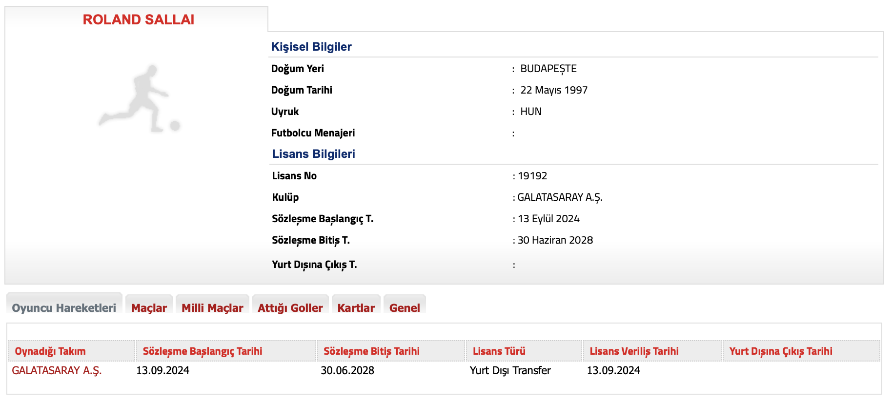 Galatasaray, Roland Sallai için TFF'ye lisans bildiriminde bulundu.