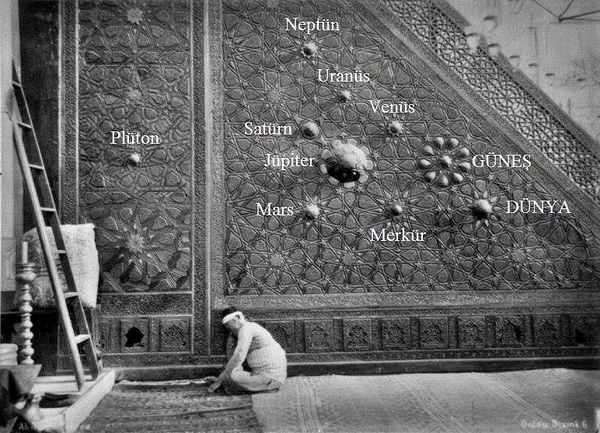 Tarihî minber üzerinde Güneş ve Galaksi sistemlerinin gözüktüğü bu zengin mirasta işlenmiş olan gezegenlerin büyüklük oranlarının ve yörüngelerinin de gerçek ölçülerle aynı olması ise şaşkınlık vericidir.