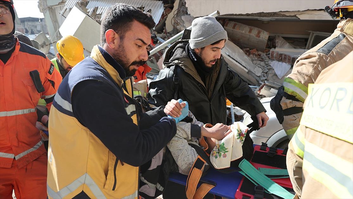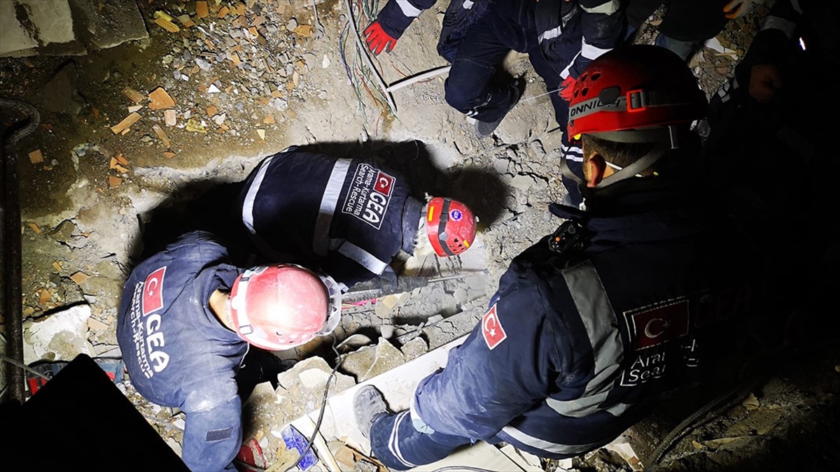 Antakya ilçesi Cebrail Mahallesi Varlık Sokak'taki 5 katlı Çağlar Apartmanı'nın enkazında çalışma yapan Güney Koreli ekip ile gönüllüler, gelen sesler üzerine çalışmalarını bu alanda yoğunlaştırdı.