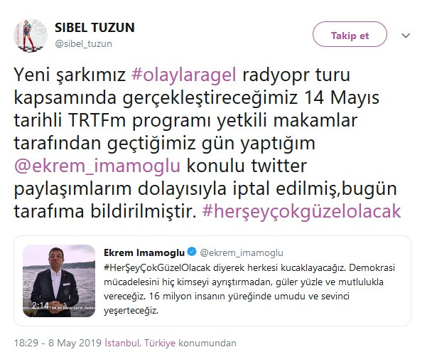 Tüzün Twitter hesabından yapmış olduğu paylaşımda, “Yeni şarkımız #olaylaragel radyopr turu kapsamında gerçekleştireceğimiz 14 Mayıs tarihli TRTFm programı yetkili makamlar tarafından geçtiğimiz gün yaptığım @ekrem_imamoglu konulu twitter paylaşımlarım dolayısıyla iptal edilmiş, bugün tarafıma bildirilmiştir. #herşeyçokgüzelolacak”