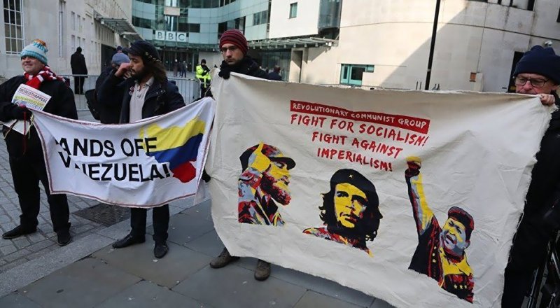 'Devrimci Komünist Grup' öncülüğündeki bir grup eylemci, İngiliz kamu yayın kuruluşu BBC önünde İngiliz basınının Venezüella'daki gelişmeleri haberleştirme şeklini protesto etti.