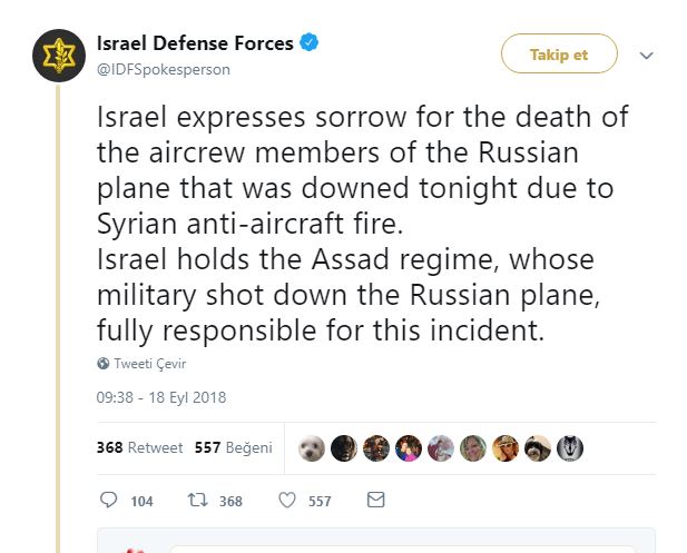 Rus uçağının 15 mürettebatıyla Akdeniz'de düşmesinin ardından Rusya Savunma Bakanı Sergey Şoygu'nun İsrailli mevkidaşı Avigdor Liberman'la yaptığı telefon görüşmesinde sorumlunun İsrail olduğunu söylemesinin ardından İsrail ordusundan açıklama geldi.