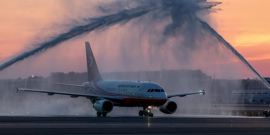 Havalimanında bekleyen itfaiye takımı, ilk kez iniş yapması sebebiyle Erdoğan'ın uçağını bir havacılık geleneği olan su takı ile karşıladı.