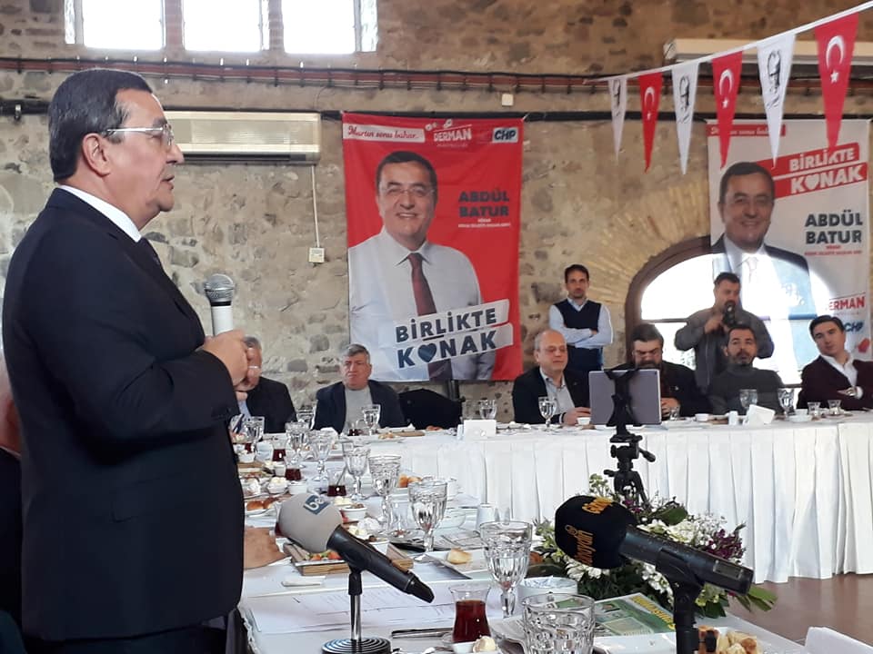 Büyükşehir Belediye Başkanlığına aday adayı olan ancak partisince Konak ilçesine adaylığı açıklanan Abdül Batur, Alsancak Tarihi Havagazı Fabrikası’nda, basın mensuplarıyla kahvaltıda buluştu. “Birlikte Konak” sloganıyla yola çıktığını ifade eden Batur “Sıkıntıları yerinde inceledik ve bu bölgedeki sorunları bir mimar vizyonuyla çözmek için hemen çalışmalarımıza başlıyoruz.Kentin planlama noktasında, çalışmalar yürütmemiz gerekiyor. Yıllardır sıkıntı yaşayan bölgelerin yerinde dönüşüm sağlanması noktasında Narlıdere’deki tecrübemizi Konak’a da aktaracağız.Narlıdere’de herkesin memnun kaldığı bir kentsel dönüşüm çalışması yaptık. Bu konuda oradaki vatandaşlarımız en iyi referansımız haline geldi. Konak’ta da yaptığımız en başarılı işlerden bir tanesi kentsel dönüşüm olacaktır. En önemli hedefim Kentsel Dönüşüm” dedi.