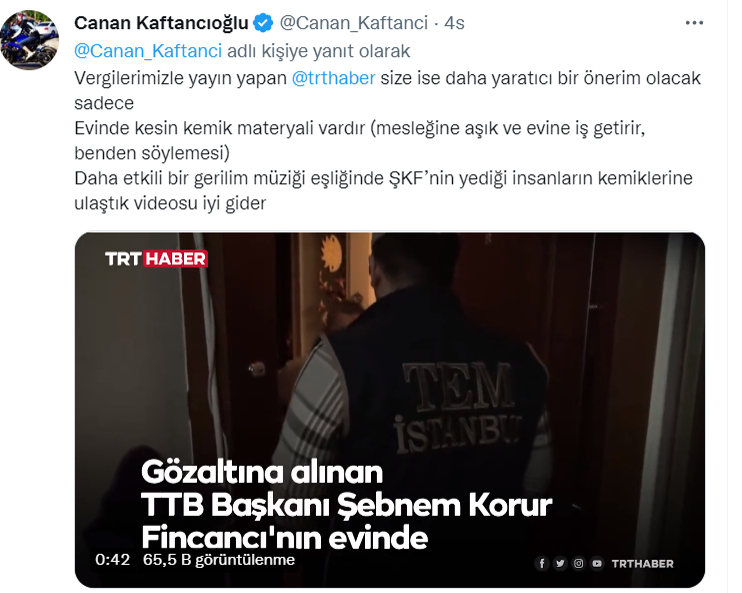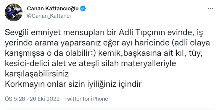 CHP’nin tartışmalı İstanbul İl Başkanı Canan Kaftancıoğlu, gözaltına alınan Fincancı’nın evinde bulunanlarla ilgili olarak “Sevgili emniyet mensupları bir Adli Tıpçının evinde, iş yerinde arama yaparsanız eğer ayı haricinde (adli olaya karışmışsa o da olabilir:) kemik, başkasına ait kıl, tüy, kesici-delici alet ve ateşli silah materyalleriyle karşılaşabilirsiniz. Korkmayın onlar sizin iyiliğiniz için” dedi.