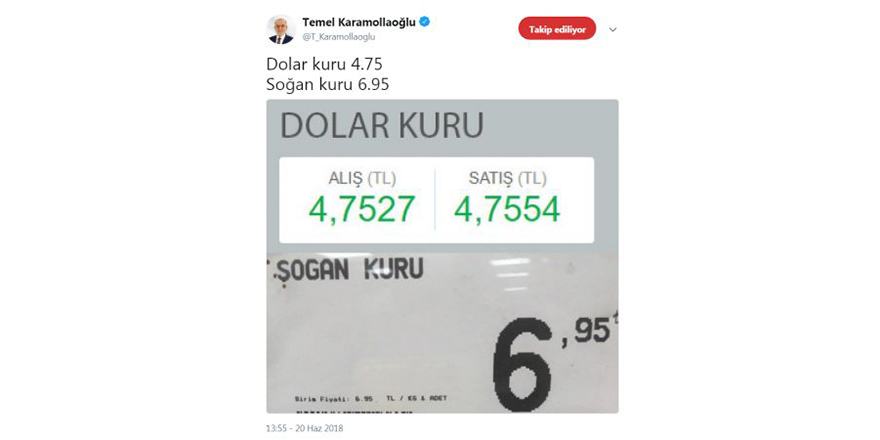 Sosyal medyayı etkin bir şekilde kullanmasıyla bilinen Saadet lideri Karamollaoğlu, "Dolar kuru 4.75, Soğan kuru 6.95" ifadelerini kullandı.