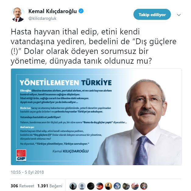 CHP Genel Başkanı Kemal Kılıçdaroğlu , ithal etlerde şarbon hastalığına rastlanmasına tepki gösterdi.