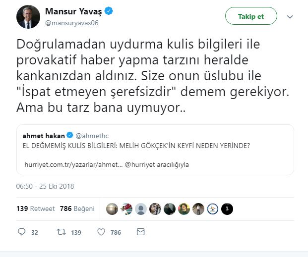 Ahmet Hakan, Hürriyet'te yayınlanan yazısında "El değmemiş kulis bilgileri… Melih Gökçek'in keyfi yerindeymiş" başlığıyla yayımlanan yazısında "Ne zaman arasam telefonumu daha ilk çalışta açan Melih Gökçek, uzun uzuuun çaldırmalarım karşısında bana mısın demedi" dedi.