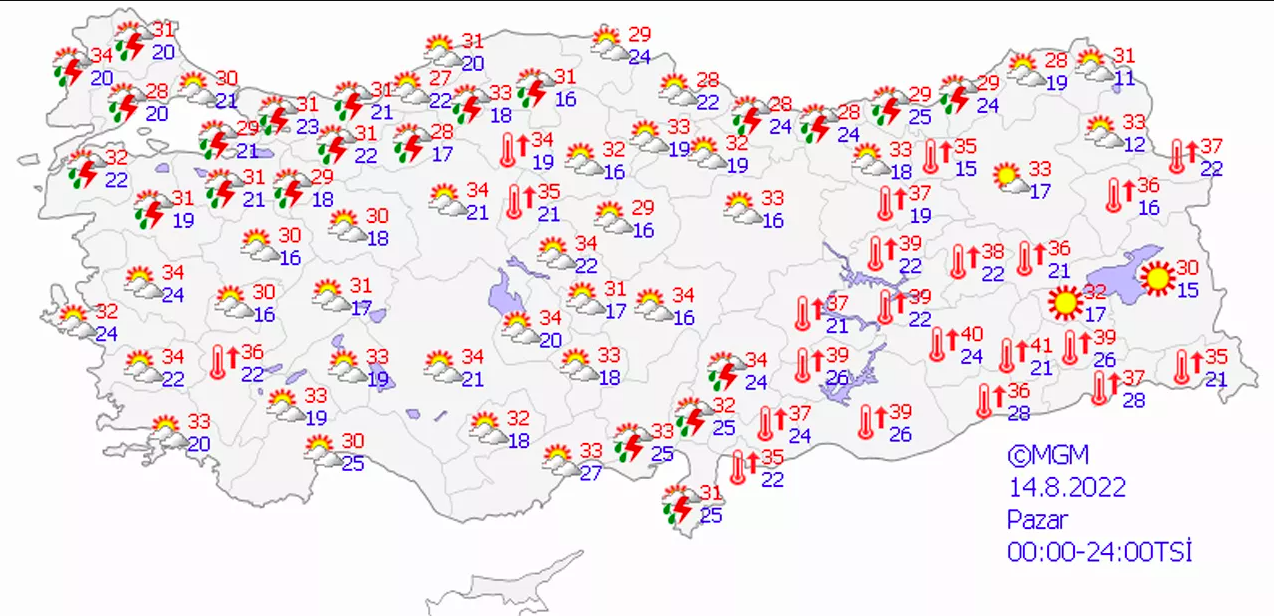 Meteoroloji 14 Ağustos 2022 hava durumu tahmin raporunu yayımladı. Buna göre, İstanbul dahil birçok kentte yer yer kuvvetli sağanak bekleniyor.