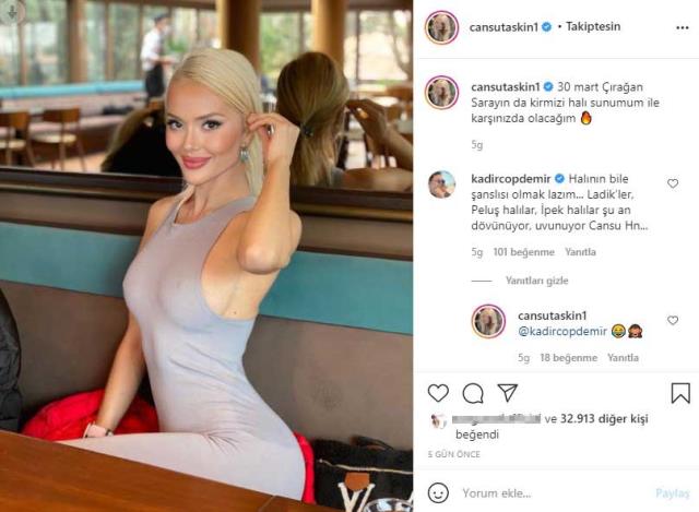 Paylaşımına "30 Mart 2021'de Çırağan Sarayı'nda kırmızı halı sunumum ile karşınızda olacağım" notunu ekleyen Taşkın'a en ilginç yorum oyuncu Kadir Çöpdemir'den geldi. Çöpdemir, Taşkın'ın bu karesinin altına "Halının bile şanslısı olmak lazım... Ladik'ler, Peluş halılar, İpek halılar şu an dövünüyor, uvunuyor Cansu Hanım" yorumunda bulundu.
