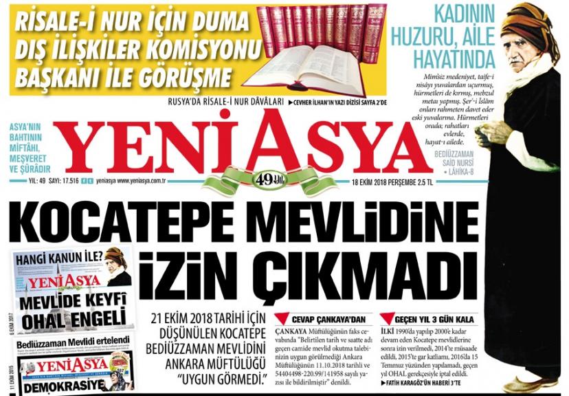 Nurcuların yayın organı Yeni Asya gazetesinin 21 Ekim günü Ankara'da Said Nursi için okutmak istediği mevlide Ankara Müftülüğü'nden izin çıkmadı