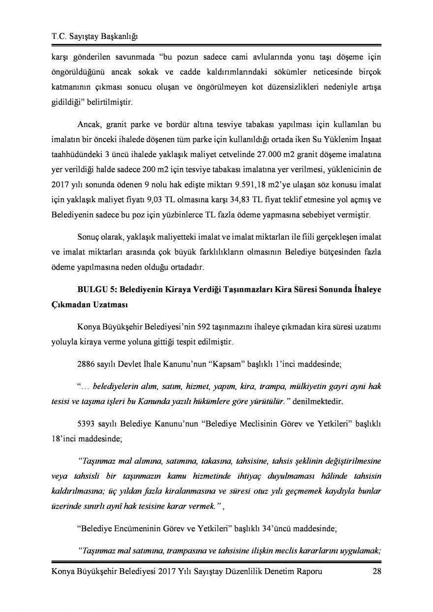 "...granit parke ve bordür altına tesviye tabakası yapılması için kullanılan bu imalatın bir önceki ihalede döşenen tüm parke için kullanıldığı ortada iken Su Yüklenim İnşaat taahhüdündeki 3 üncü ihalede yaklaşık maliyet cetvelinde 27.000 m2 granit döşeme imalatına yer verildiği halde sadece 200 m2 için tesviye tabakası imalatına yer verilmesi, yüklenicinin de 2017 yılı sonunda ödenen 9 nolu hak edişte miktarı 9.591,18 m2’ye ulaşan söz konusu imalat için yaklaşık maliyet fiyatı 9,03 TL olmasına karşı 34,83 TL fiyat teklif etmesine yol açmış ve Belediyenin sadece bu poz için yüzbinlerce TL fazla ödeme yapmasına sebebiyet vermiştir."