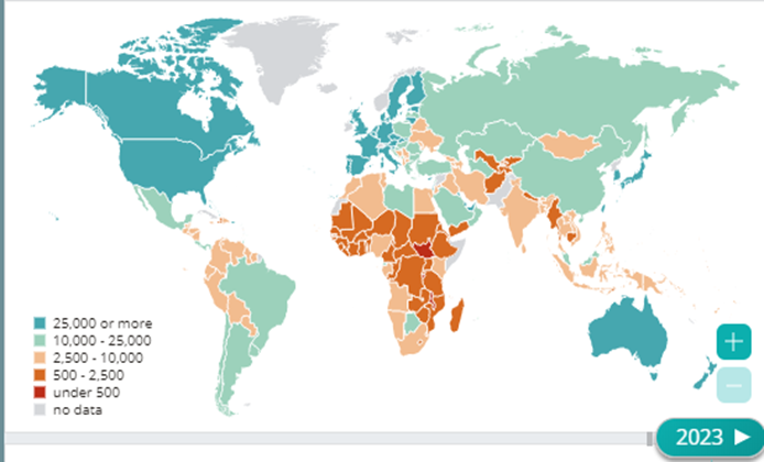 Cari fiyatlarla GSYH OVP’da 2018’de 854 milyar dolar iken bu rakam YEP’da 763 milyar dolara çekilmiştir. Aradaki fark 91 milyar dolardır. Bu, OVP’daki hedeften önemli bir sapmayı gösterir. YEP’da 2017 yılında 10,602 dolar olan kişi başına GSYH’nın 2018’de 9,385 dolar olacağı tahmin edilmiştir. Kişi başına GSYH tahmini 2019’da 9,647, 2020’de 10,292, 2021’de ise 10,973 dolar olacaktır. Dünya Bankası’na göre 2002 yılında kişi başına gelir 3,660 dolar iken 2017 yılında 10,540 dolara çıkmıştır ama Türkiye, 2023 yılına kadar 10 bin dolar olan orta gelir tuzağından kurtulamayacaktır. Dünya Bankası’na göre 2023 yılında ülkelerin kişi başına düşen gelir tahminleri aşağıdaki şekillerde gösterilmiştir.