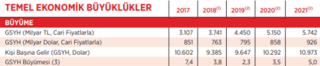 2017 yılında GSYH 3 trilyon 107 milyar TL (851 milyar dolar) olarak gerçekleşmiş, ortalama dolar kuru 3,65 TL olmuştur. YEP’te bu yıl GSYH’nın TL bazında 3 trilyon 741 milyar, dolar bazında 763 milyar olması öngörülmüş, 2018 yılında ortalama dolar kuru 4,90 TL olarak tahmin edilmiştir. Dolar kuru bu yıl Ocak-Nisan döneminde 3,70-4,00 TL, Mayıs- Temmuz döneminde 4,00-4,90 TL aralığında seyrettikten sonra Ağustos ayından bu yana 5,00-6,90 arasında dalgalanmıştır. YEP’teki tahminlerde, dolar kurunun yıllık ortalaması esas alınmıştır. Bu tahminler gerçekçi olmayan aşırı iyimser varsayımlara dayanmaktadır. 2019 yılı ortalama dolar kuru bugünkü şartlarda 5,60 seviyesinin üstünde olacaktır.