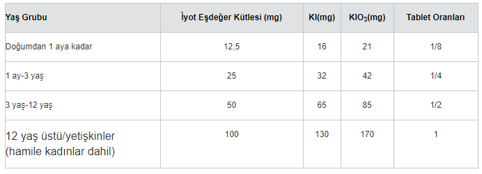 İyot tabletleri maksimum toplam doz 1 gramı geçmemek üzere aşağıdaki dozlarda kullanılır;